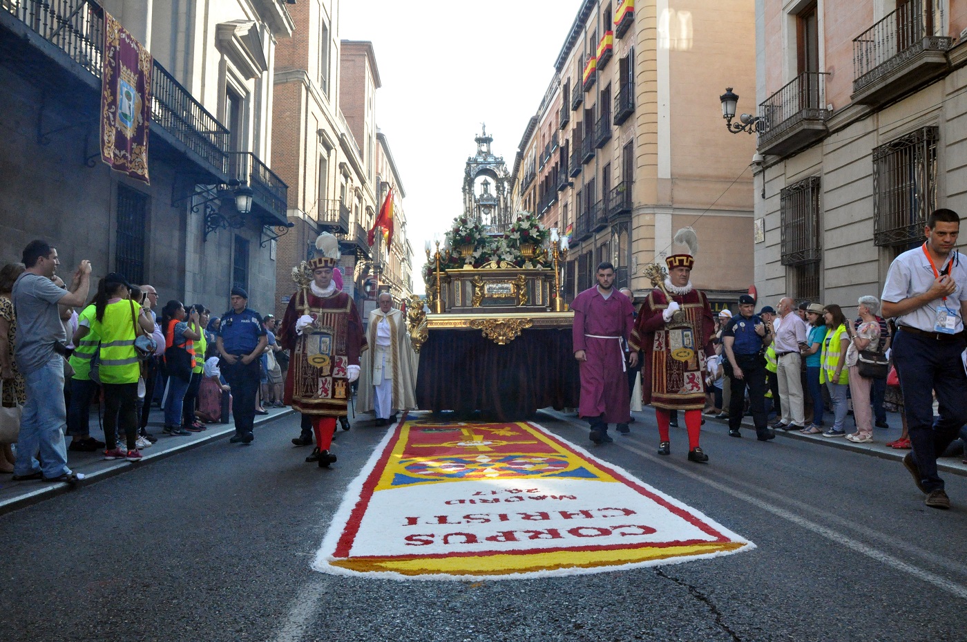 Hasta las 17:30 horas, el Santísimo ha permanecido expuesto para su adoración en la catedral. Y a las 19:00 horas, en la plaza de la Almudena, ha dado comienzo la tradicional procesión por las calles de Madrid bajo el lema Jesucristo está en medio de nosotros. A pesar del calor, miles de madrileños han salido a acompañar al Señor. La procesión ha estado encabezada por el cardenal Osoro, y ha discurido por las calles Mayor, Milaneses y Santiago, plaza de Ramales, plaza de Oriente, calle de San Quintín y calle Bailén, con vuelta a la plaza de la Almudena.