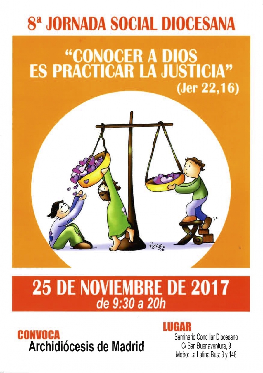 Este sábado, 25 de noviembre, se desarrollará la 8ª Jornada Social Diocesana organizada por las Vicarías de Evangelización, Acción Caritativa y Pastoral Social e Innovación del Arzobispado de Madrid, con el lema Conocer a Dios es practicar la justicia (Jer 22, 16). El encuentro, que tendrá lugar en el Seminario Conciliar (c/San Buenaventura, 9 – metro La Latina – Bus 3 y 148) entre 9:30 y 20:00 horas, está dirigido a todos los sacerdotes, religiosos, seminaristas y cristianos de la diócesis, en especial agentes de pastoral y movimientos apostólicos.
