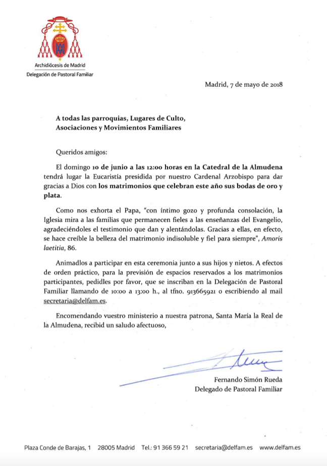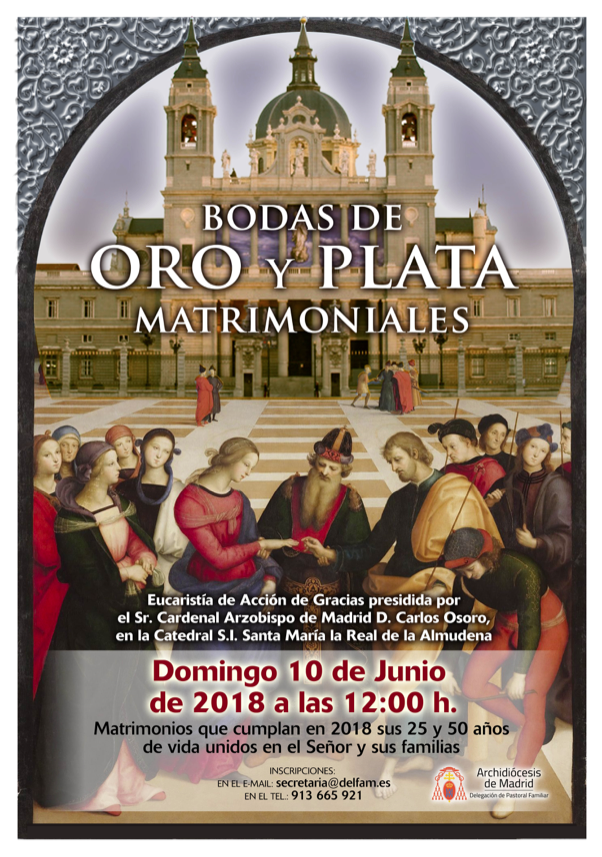 El domingo 10 de junio, a las 12:00 horas, la catedral de Santa María la Real de la Almudena acogerá una Misa, presidida por el obispo auxiliar monseñor Juan Antonio Martínez Camino, SJ, para dar gracias a Dios con los matrimonios que este año celebran sus bodas de oro y plata.