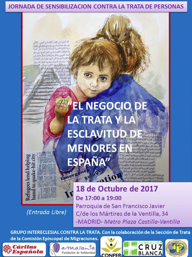 El Grupo Intereclesial sobre Trata, integrado por CONFER, Cáritas Española, Justicia y Paz, la Fundación Cruz Blanca, la Fundación Amaranta y la Comisión Episcopal de Migraciones, organiza una jornada de sensibilización en la parroquia de San Francisco Javier (c/ de los Mártires de la Ventilla, 34 - Metro Plaza de Castilla o Ventilla). Coincidiendo con el Día Europeo contra la Trata, se celebrará este miércoles, 18 de octubre, con el lema El negocio de la trata y la esclavitud de menores en España.