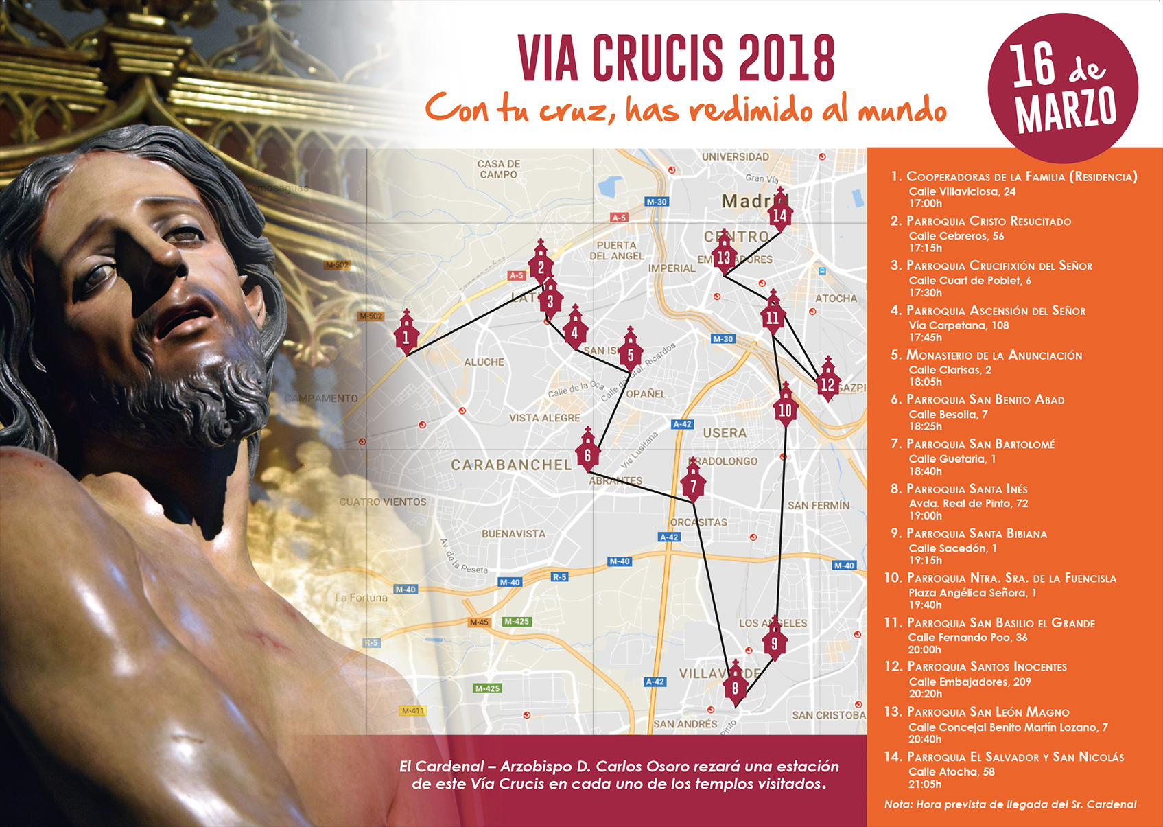 El viernes 16 de marzo, a partir de las 17:00 horas, se desarrollará el vía crucis diocesano, que este año tiene como lema Con tu Cruz, has redimido al mundo. El cardenal arzobispo de Madrid, Carlos Osoro, rezará una estación de este vía crucis en cada uno de los templos visitados. El recorrido es el siguiente: