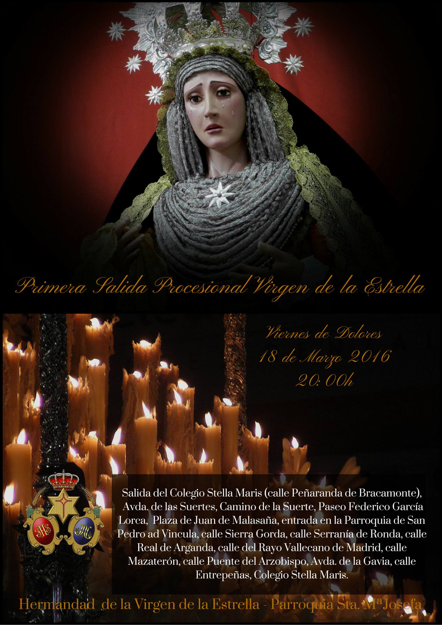 El próximo viernes de Dolores, 18 de marzo, sacarán a la Virgen en procesión desde el colegio Stella Maris La Gavia, pasando por varias calles del Ensanche de Vallecas hasta llegar a Villa de Vallecas. Harán una parada en la Iglesia de San Pedro Ad Víncula, y regresarán al colegio Stella Maris.